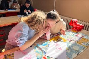 Na naší škole je propojování a posilování vzájemných mezipředmětových vazeb zcela běžnou záležitostí. Dokazujeme si, že zdánlivě nepropojitelné nakonec stejně propojit lze, a navíc přináší i docela zajímavé výsledky. Sedmáci si tímto způsobem spojili výtvarku s chemií – zkoušeli totiž pomocí chemického pokusu vytvořit barevné pozadí pro kresbu vybraného motivu tuší. Použili k tomu suroviny běžně dostupné a především zdravotně nezávadné – vodu, jar a zbytky temperových barev, které jsme měli již delší dobu v našem výtvarném ateliéru a bylo nutné je co nejdříve spotřebovat. Zapotřebí bylo mít připraven ještě plastový kelímek a brčko. Smícháním surovin vznikla směs, do které žákyně/žák ponořil brčko a foukáním vytvořil bubliny či pěnu v barvě, kterou použil při míchání směsi. V okamžiku, kdy bubliny přesáhly okraj kelímku, bylo nutné je co nejrychleji obtisknout na bílou čtvrtku. Jednotlivé odstíny bublin si pak žákyně a žáci vzájemně vyměnili, příp. namíchali další, aby bylo pozadí čtvrtky co nejbarevnější. Takto připravené strukturované pozadí jsme museli nechat pořádně zaschnout, aby se nám při kresbě květinového motivu nerozpíjela tuš. Této chvíle žákyně a žáci využili k návrhu kresleného motivu tužkou na náčrtkový papír. Když podklad řádně zaschl, nastala poslední fáze tvorby uměleckého díla, tedy samotná kresba připraveného motivu. Žákyně a žáci si vyzkoušeli další netradiční výtvarnou techniku, zopakovali si postup při kresbě tuší, a co víc, rozptýlili se, pobavili a relaxovali, čímž byly cíle této dvouhodinové výtvarky stoprocentně naplněny.