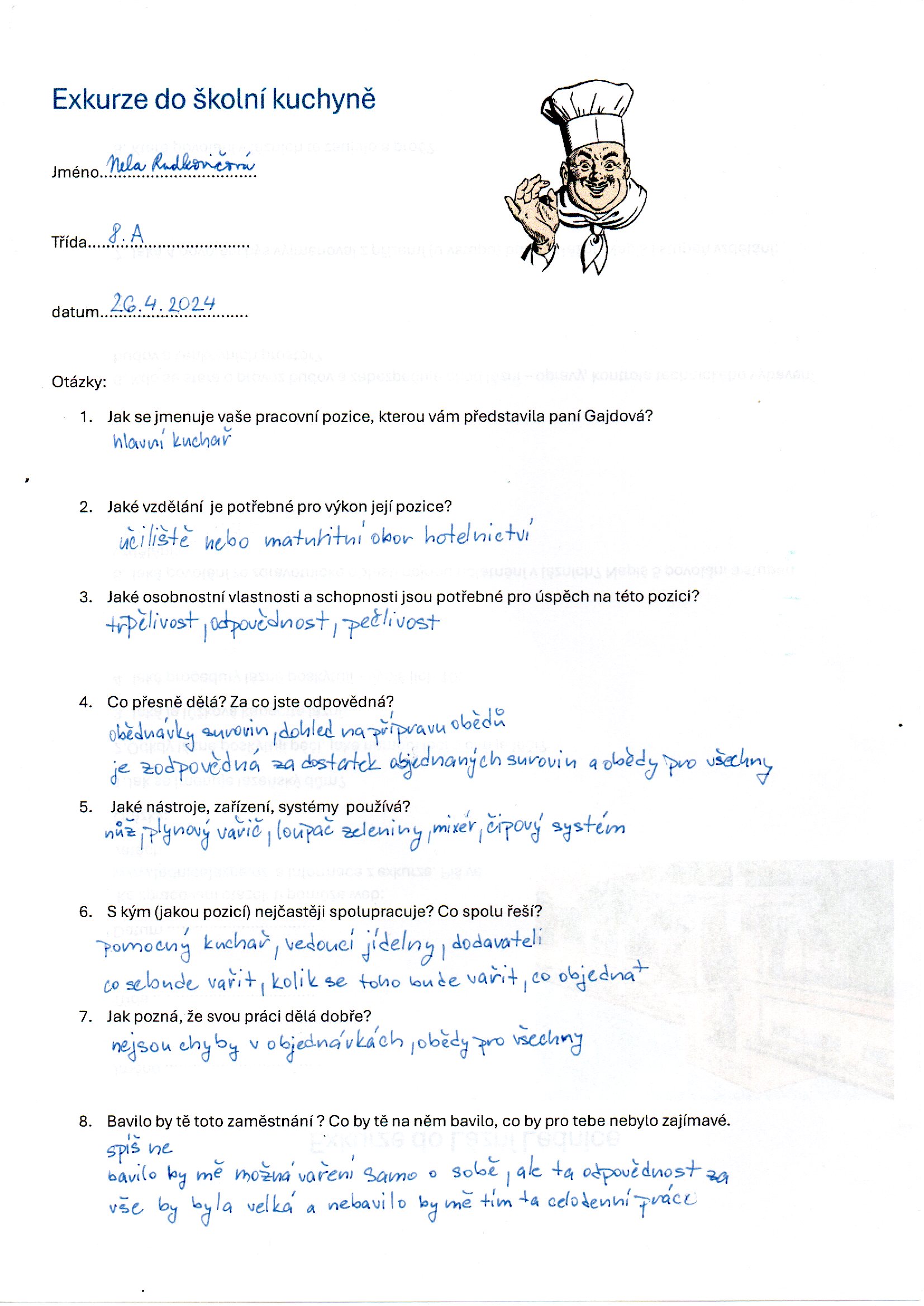 Žáci 8.tříd v předmětu pracovních činností zaměřených na volbu povolání dostali příležitost nahlédnout do školní kuchyně. Cílem této návštěvy bylo seznámení žáků s profesemi v gastronomii a také jim ukázat, co všechno obnáší práce v kuchyni – od plánování jídelníčku, výběr a nákup surovin, přípravy pokrmů, přes dodržování hygienických předpisů až po úklid. Práce v kuchyni vyžaduje týmovou spolupráci, každý člen přispívá k celkovému výsledku.