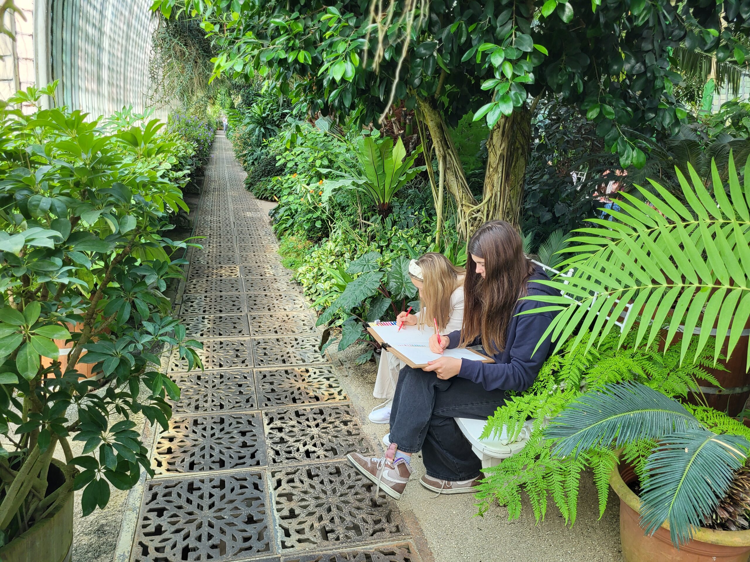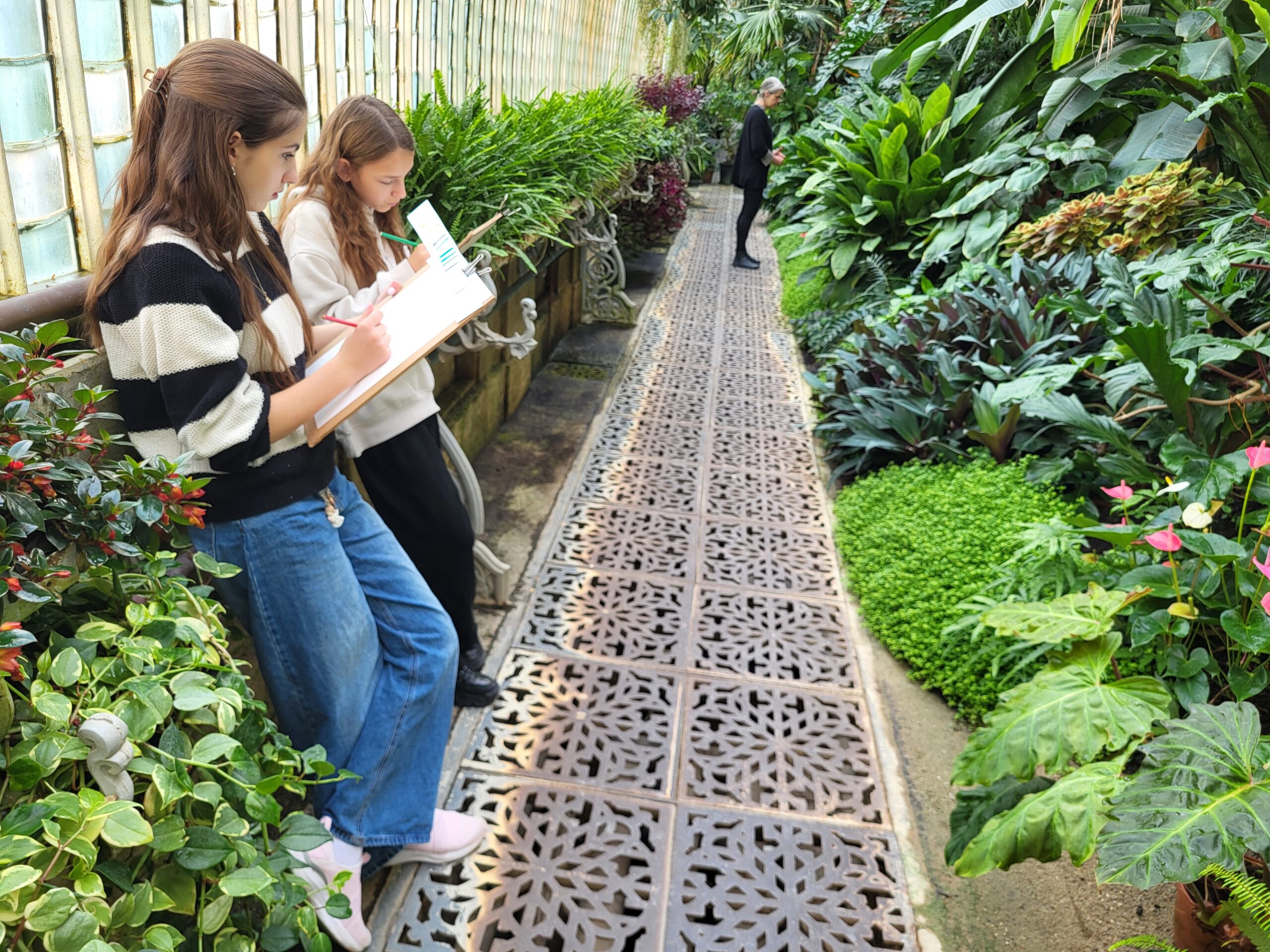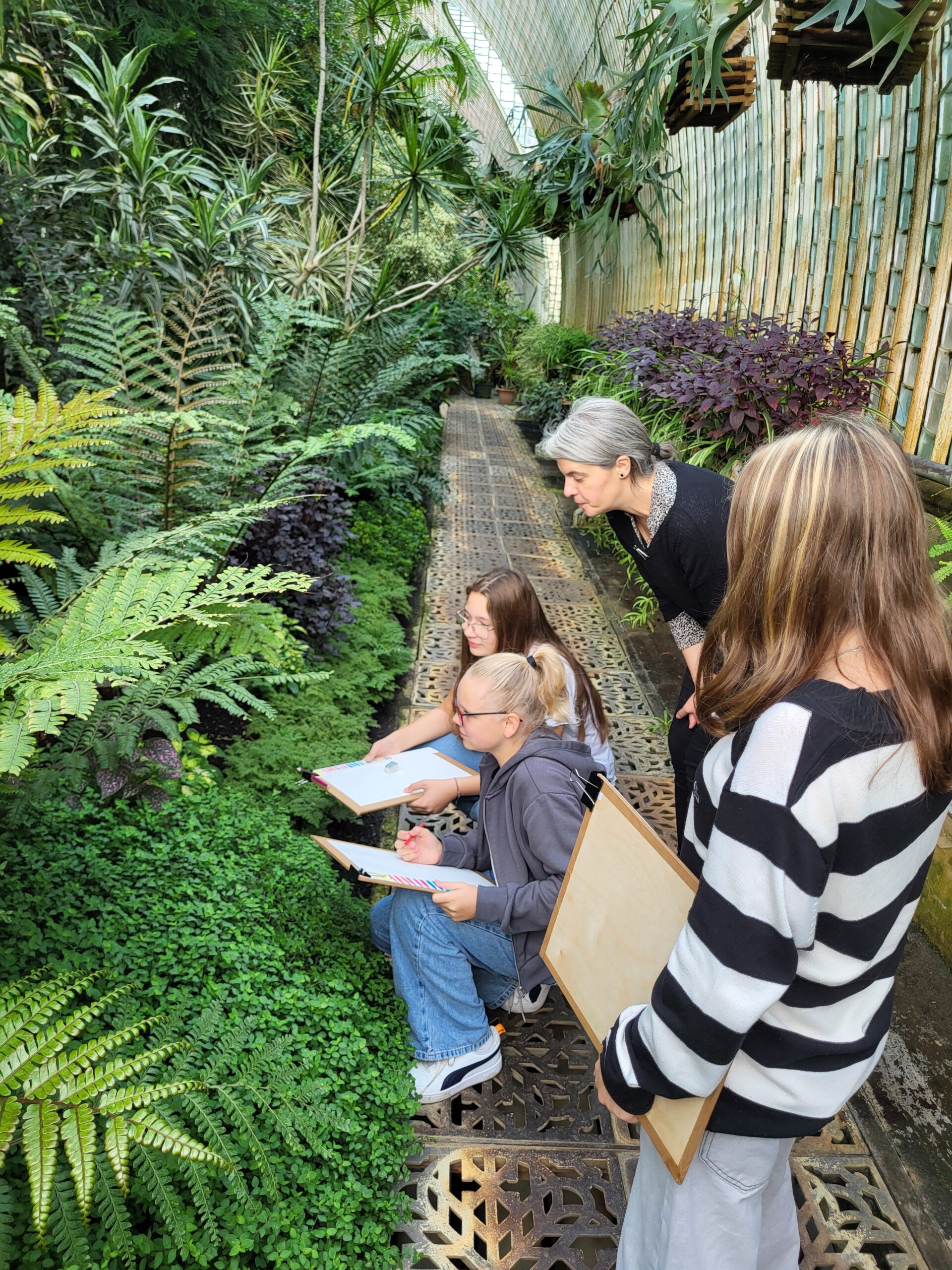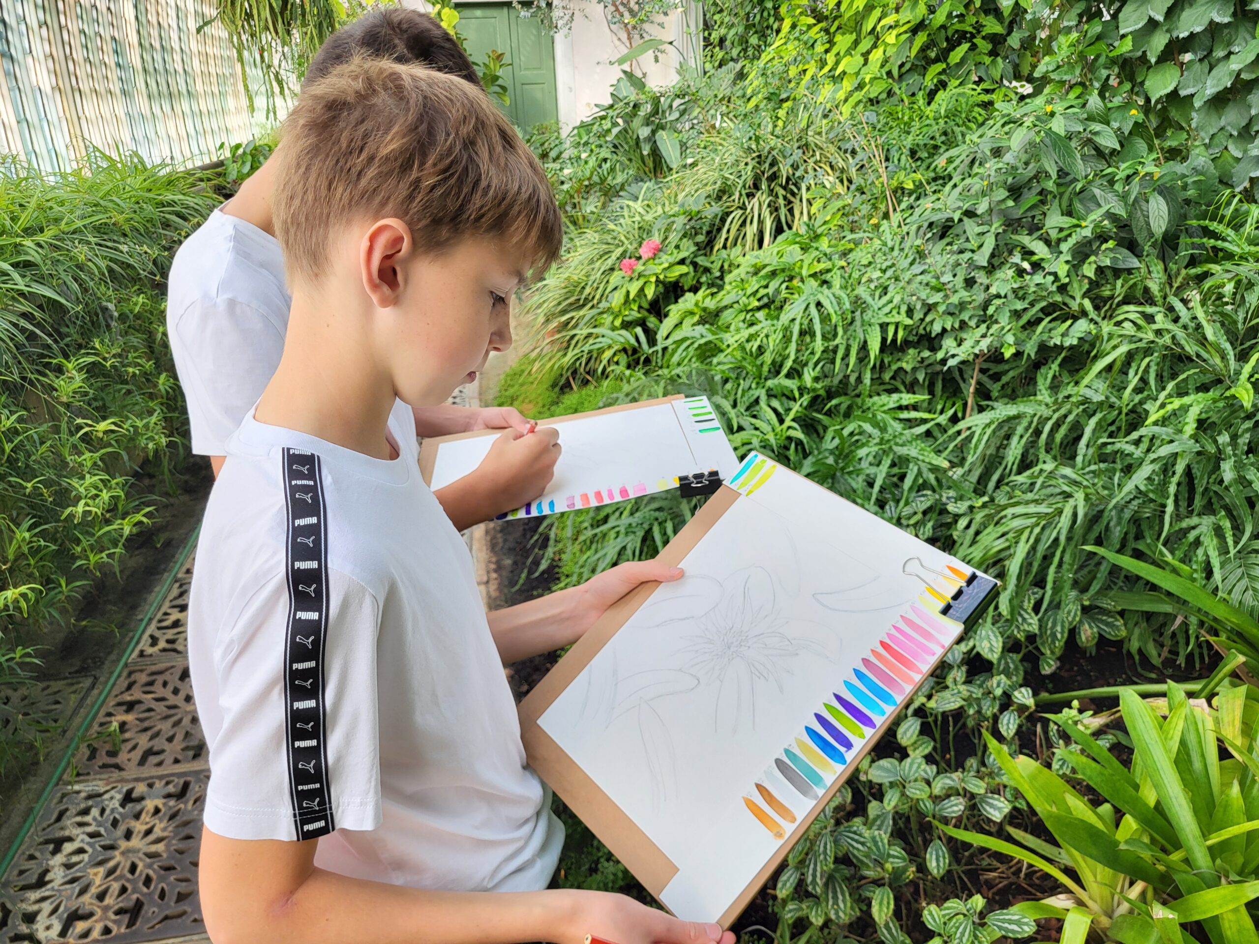 Stejný postup si vyzkoušeli i naši sedmáci. Nejprve si připravili vlastní barevnou paletu, s níž se vydali do zámeckého skleníku. Tam si vybrali jednu rostlinu, kterou nakreslili a očíslovali. Po návratu do školy ji pak podle čísel vybarvili. Celý proces trval tři a půl hodiny. Žáci pracovali s velkým zaujetím, což se odrazilo i na kvalitě jejich výtvarných prací.