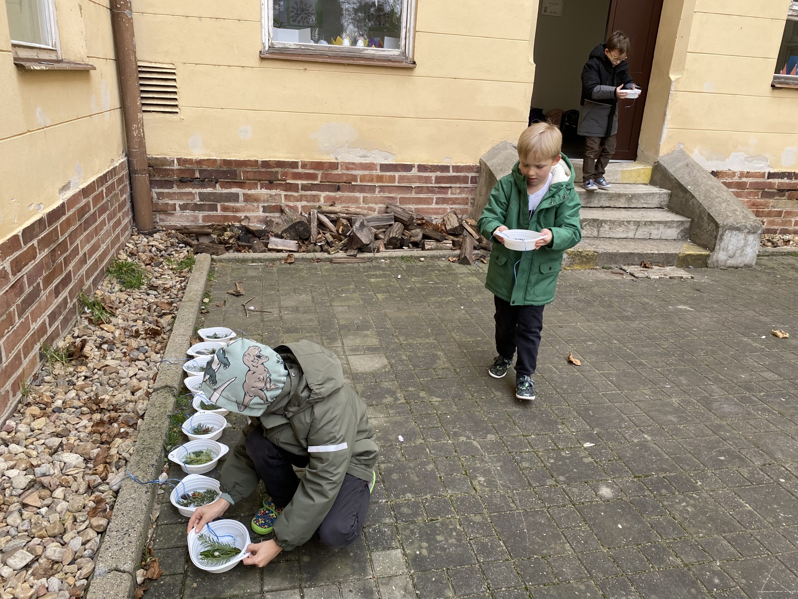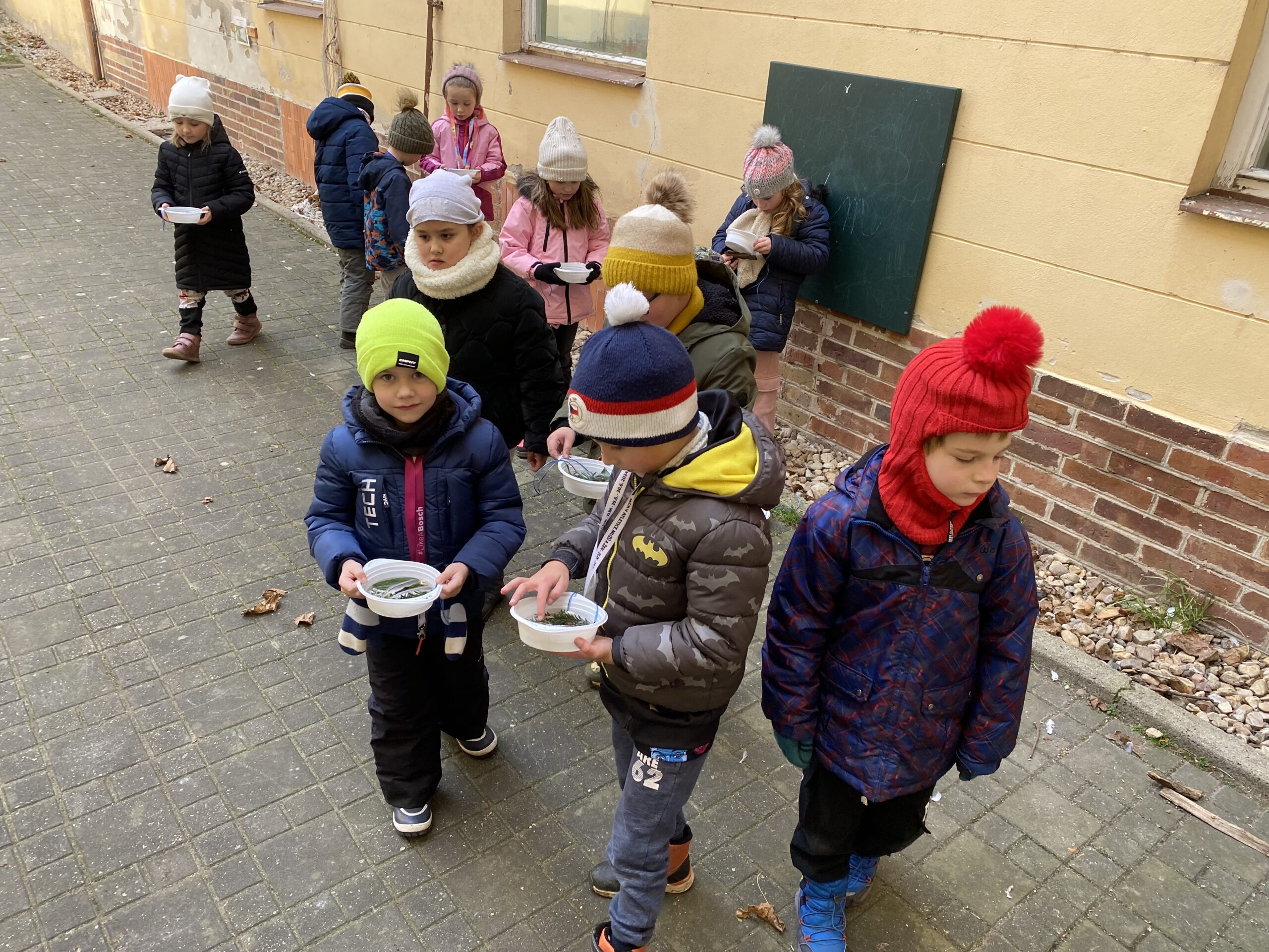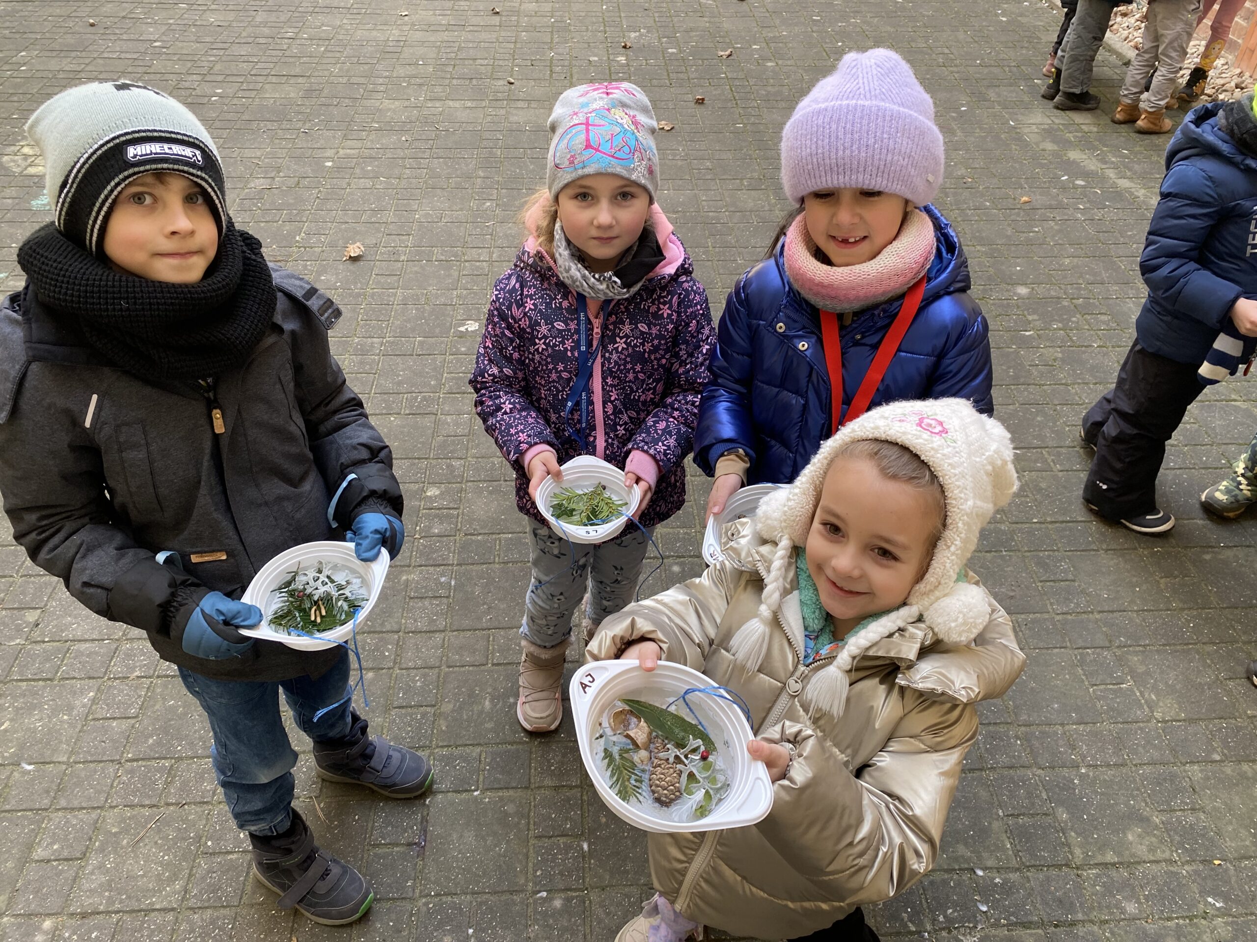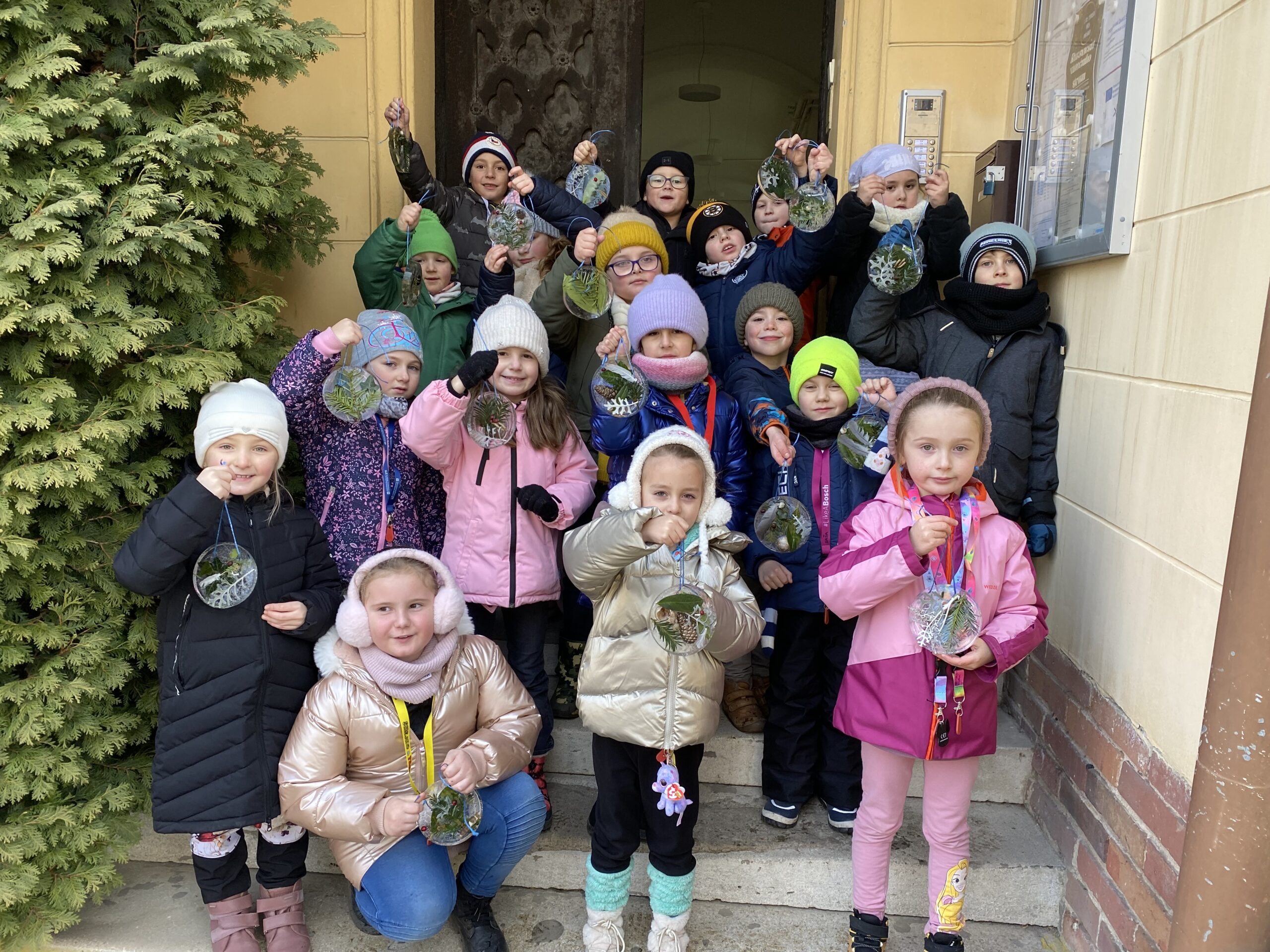 Počasí je opravdu studené a mrzne až to praští. Ale pro nás to tentokrát byla výhoda. Rozhodli jsme se spolu s přírodou vytvořit něco kouzelného. Po cestě z oběda jsme nasbírali přírodniny v parčíku. Někdo našel ulitu od šneka, jiný peříčka, žaludy, šípky, šišky, ale hlavně větvičky a lístky. V družince jsme si je naaranžovali do plastové misky, přidali šňůrku a celý výtvor zalili vodou. Pak jsme misky odnesli na dvoreček a čekali, co se stane. Mráz pracoval za nás a do druhého dne nám vykouzlil parádní ozdoby. Aby je mohli obdivovat rodiče i kolemjdoucí, zavěsili jsme je na strom u vchodu do školy. Mrznout má ještě příští týden, tak se přijďte taky podívat, než nám příroda ozdoby rozpustí.