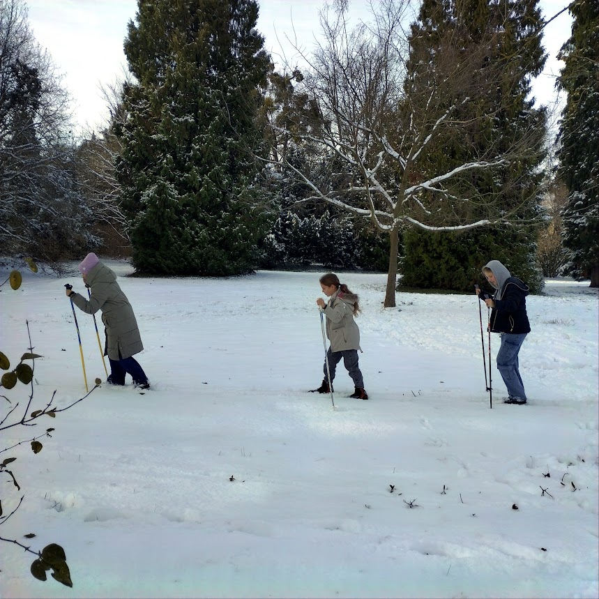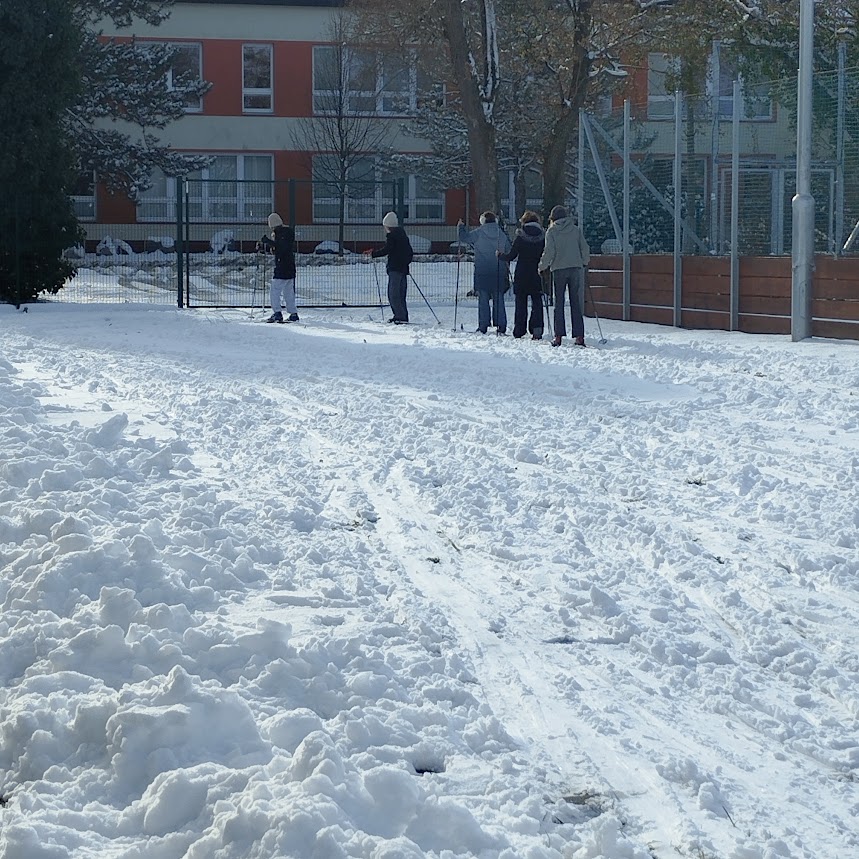 V hodině tělesné výchovy jsme s děvčaty ze 6. ročníku vytáhli běžecké lyže. Kdo chtěl, mohl si během druhé hodiny vybrat boty, lyže, hůlky a vyzkoušet si chůzi na lyžích.