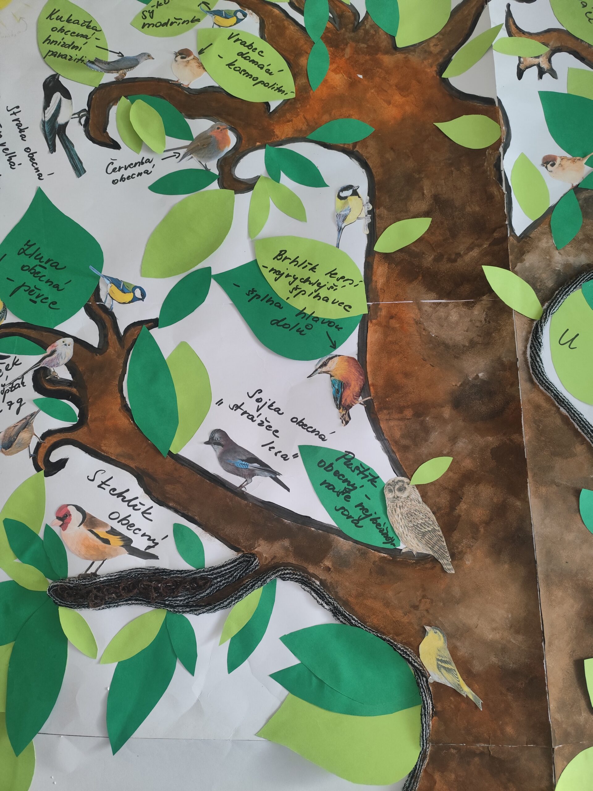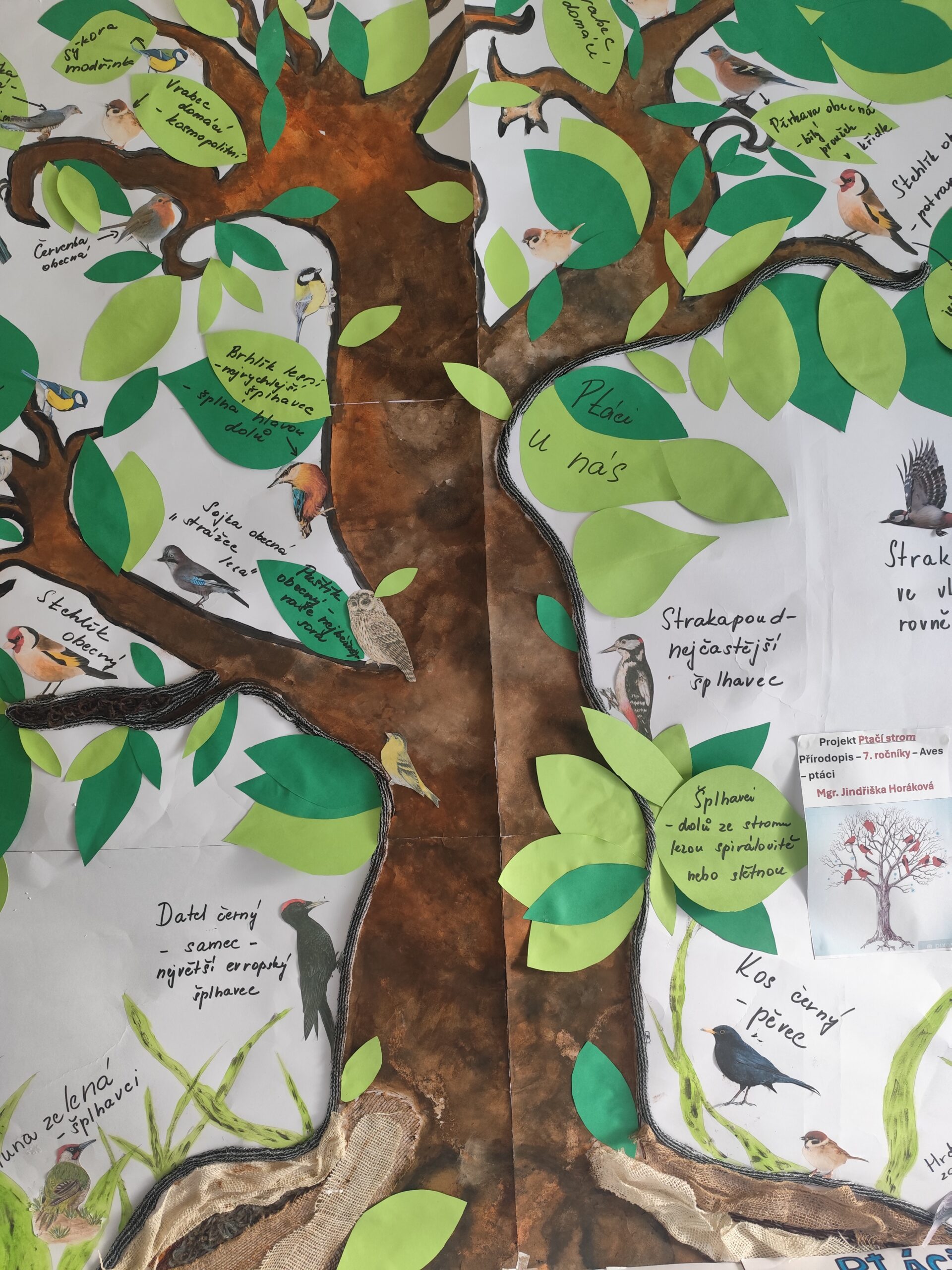 Na část projektu Ptáci u nás jsme šli v rámci mezipředmětových vztahů formou nejen obsahovou, ale také formou výtvarnou. Vytvořili jsme opravdu velký strom metodou tupování, malby, lepení zajímavých ploch pomocí bavlnek, provázků apod . Listy jsme vystřihli z barevného papíru a celý strom dotvořili našimi nejznámějšími druhy ptáků včetně rodového a druhového názvu a hlavních informací o nich.