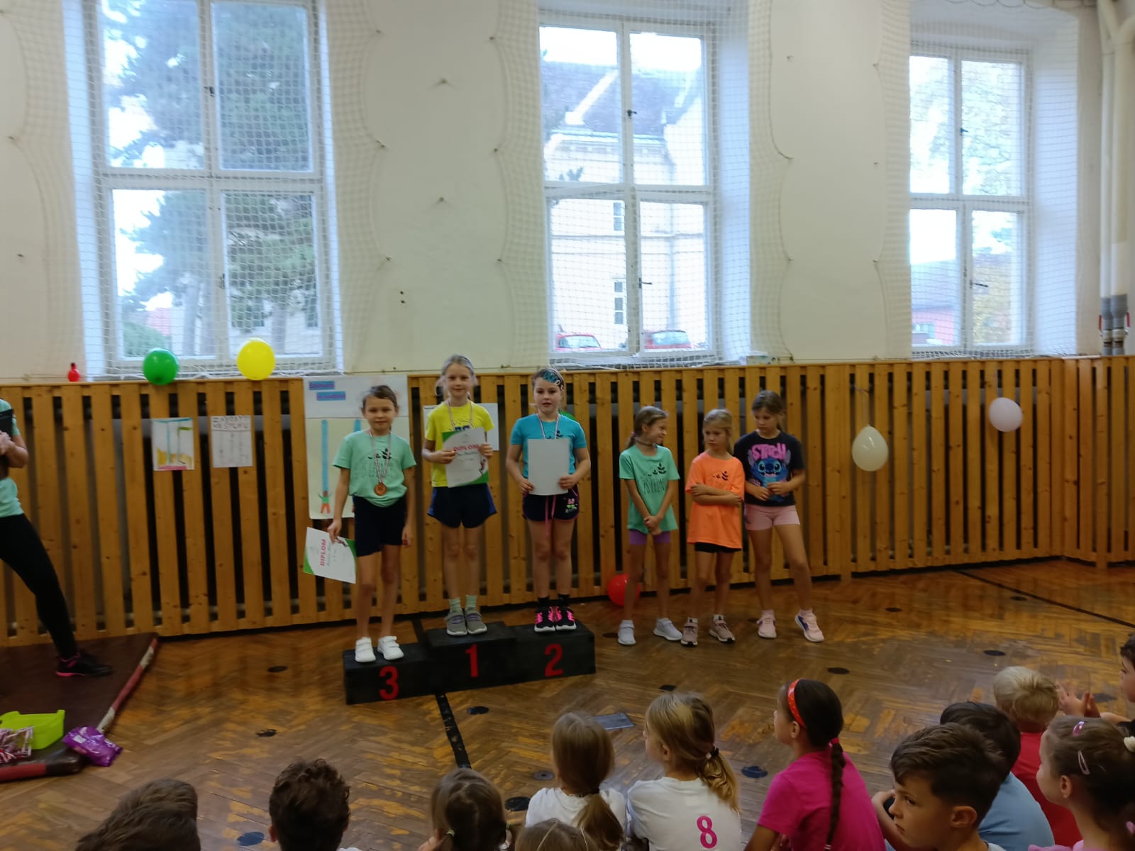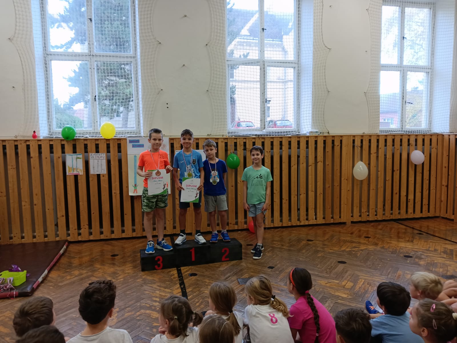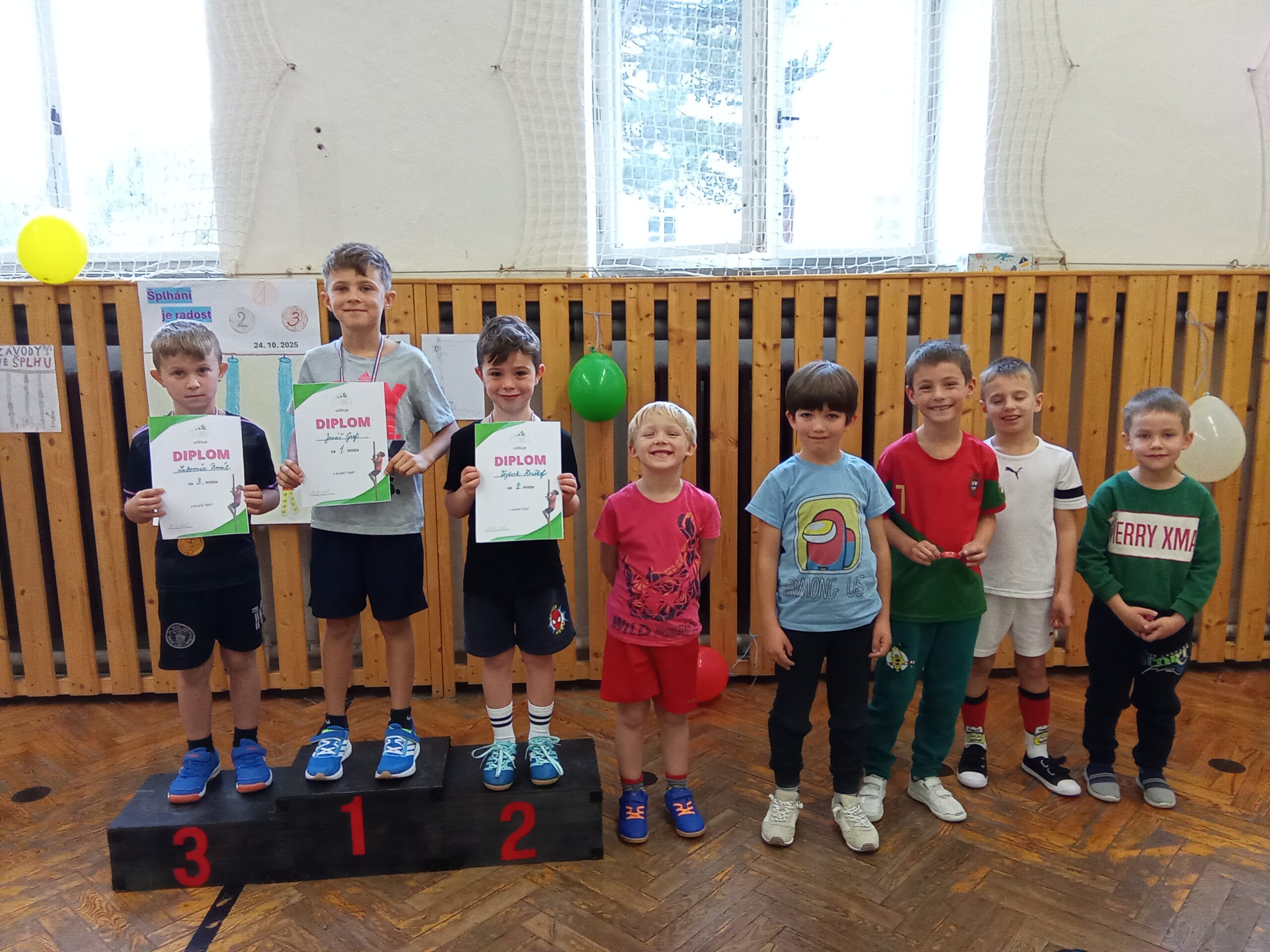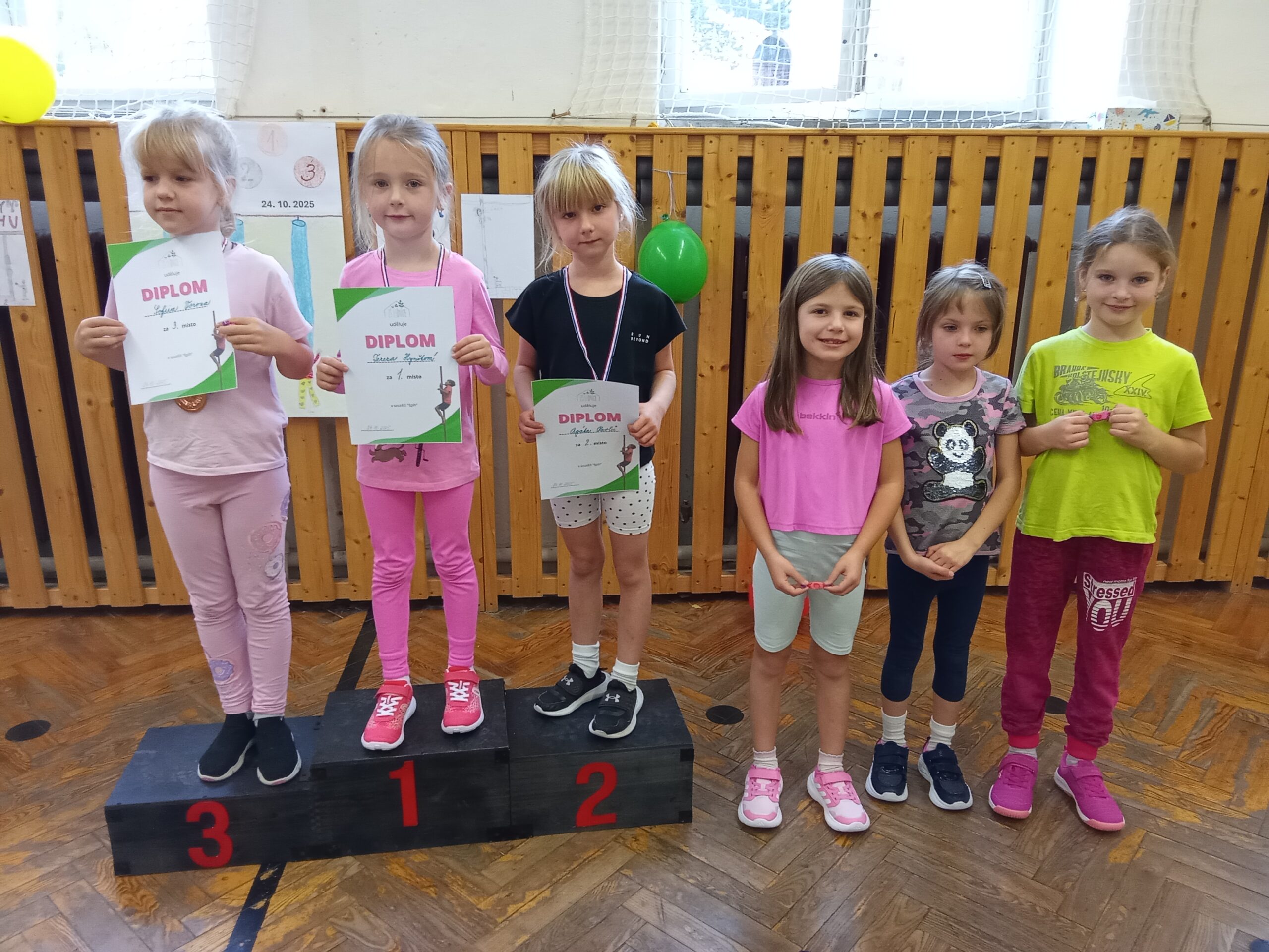 Pan školník pro ně vyrobil krásné stupínky pro vítěze, na kterých si děti hrdě převzaly své medaile a diplomy. Děkuji kolegyním za pomoc při uskutečnění těchto závodů.