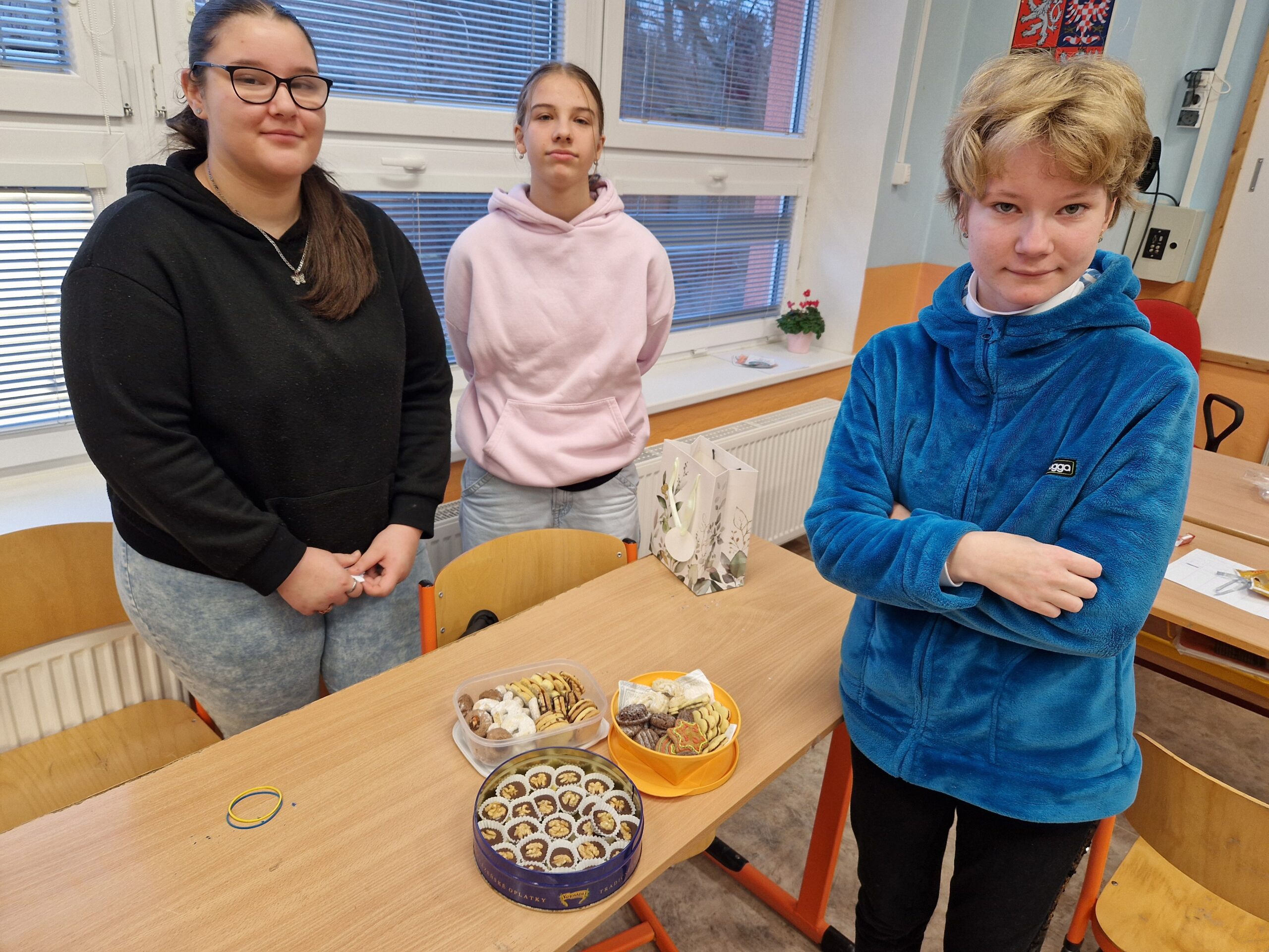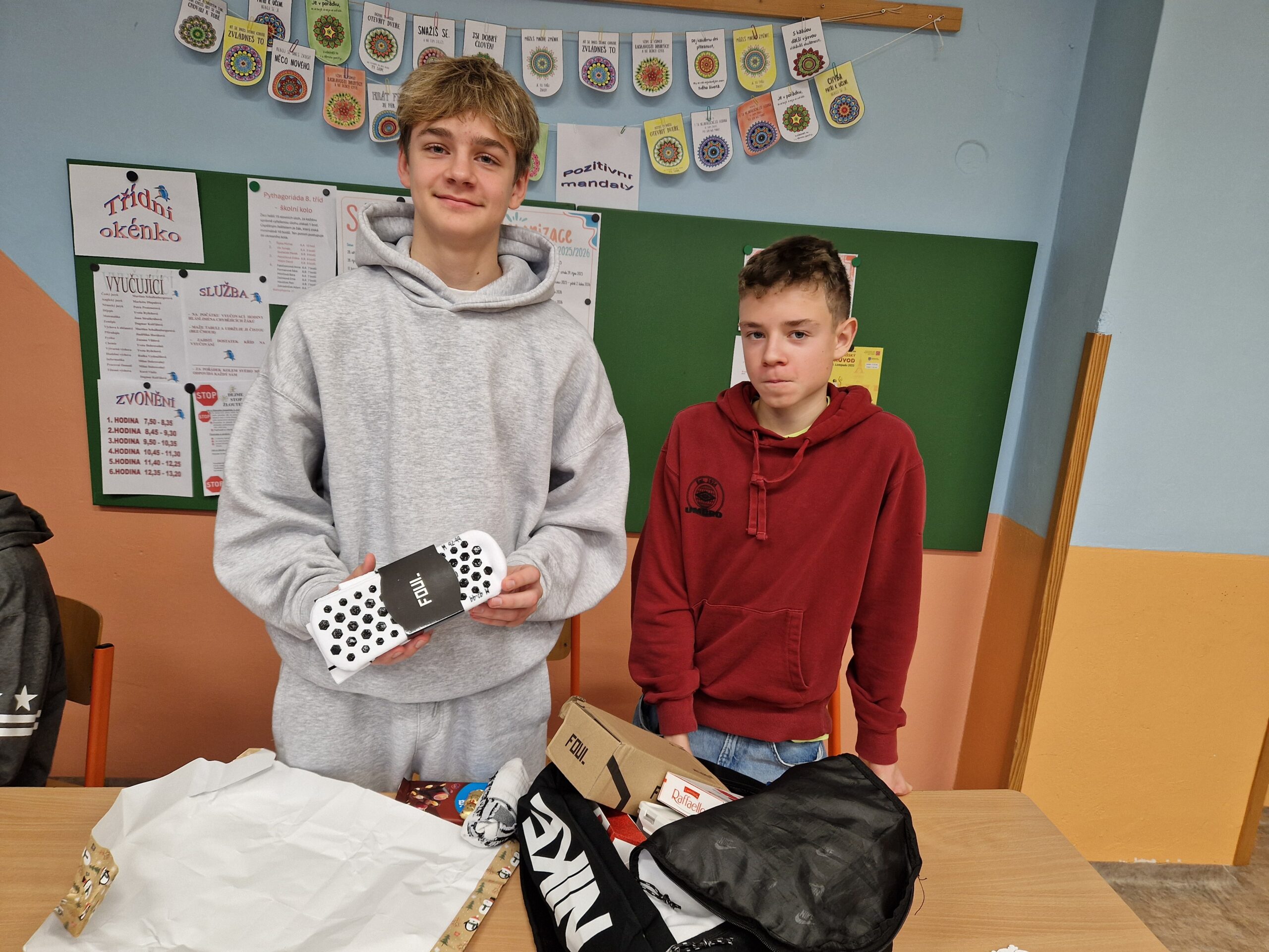 V pátek 19.12. jsme si přinesli místo svačiny vánoční cukroví, které mnohá děvčata pekla se svými maminkami. Než jsme si se spolužáky mohli předat dárky, museli jsme letos napsat poslední test. Byl to zábavný test o vánočních zvycích. Nejlepší znalosti předvedla Ema Zelinková, ale my ostatní jsme se aspoň dobře bavili. Následovalo předávání dárků, které bylo také velice veselé. Kluci si předali polštářek, fotbalistické ponožky, minikopačák, děvčata náramky a kosmetiku. Ještě se běželo do 8.B za dalšími kamarády, pak se chvíli hrály karty a stolní hry a pak už hurá do tělocvičny.