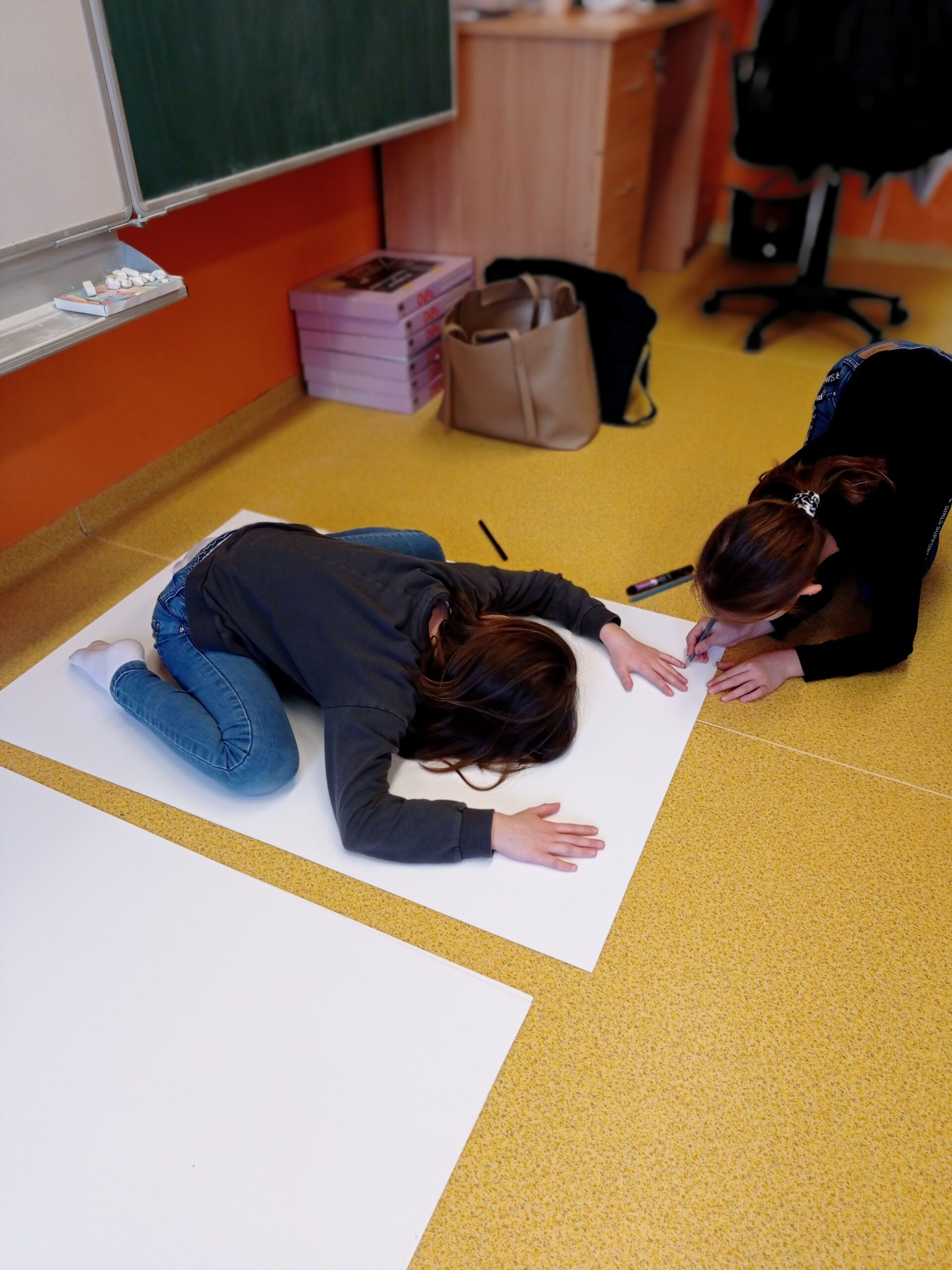 U příležitosti konání zimních olympijských her jsme se s žákyněmi a žáky rozhodli uspořádat hry vlastní. A i když se nejednalo o hry sportovní, nýbrž výtvarné, pohybu v nich bylo přece jen dost. Žákyně a žáci se rozdělili do skupinek, v rámci nichž si postupně jeden po druhém obkreslili siluetu svého těla. Předtím však museli zaujmout co nejoriginálnější pozici tak, aby se celým tělem vešli na formát výkresu A0. Byť se to nezdá, setrvat v některých pozicích po určitou dobu dalo docela zabrat.