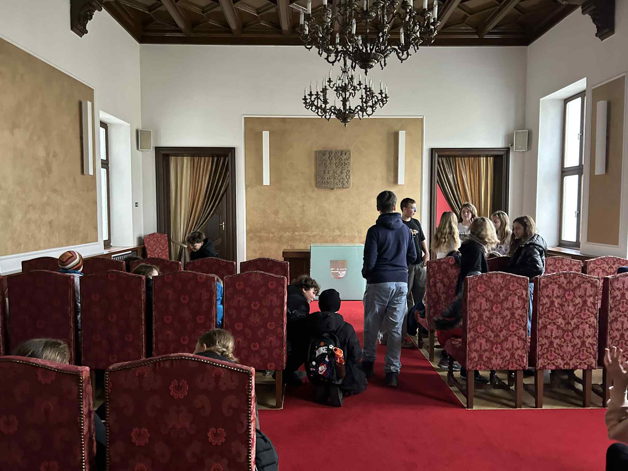 Další zastávka byla na úřadě, kde s panem místostarostou Švástou absolvovali přednášku o historii Hustopečí přímo v obřadní síni. Žáci vystoupali i do nejvyšší věže radnice a obdivovali výhled na celé město. Následně žáci z Hustopečí předvedli simulované oddání dvou lednických žáků přímo v obřadní síni – ukázku, která děti velmi zaujala a pobavila.