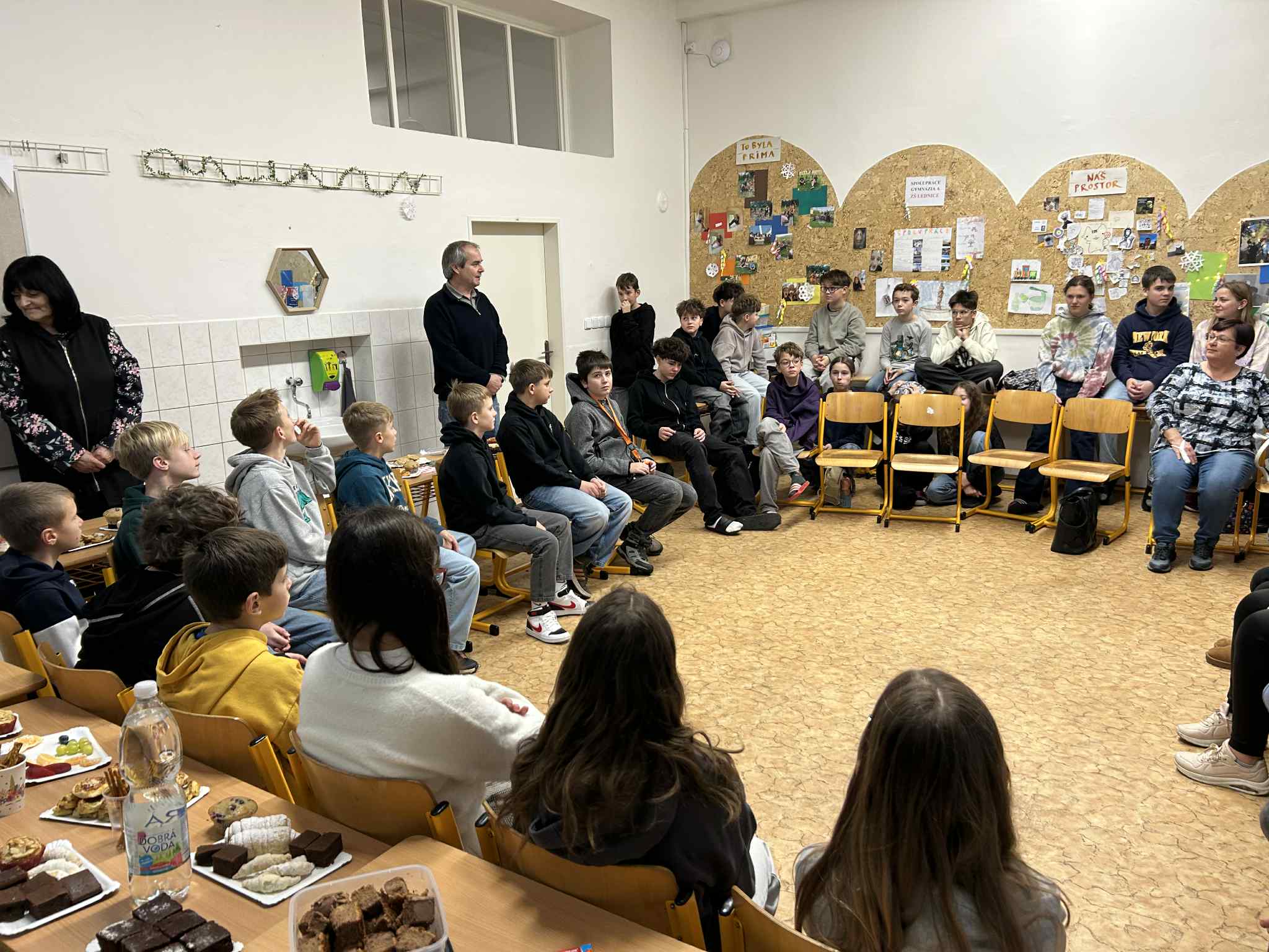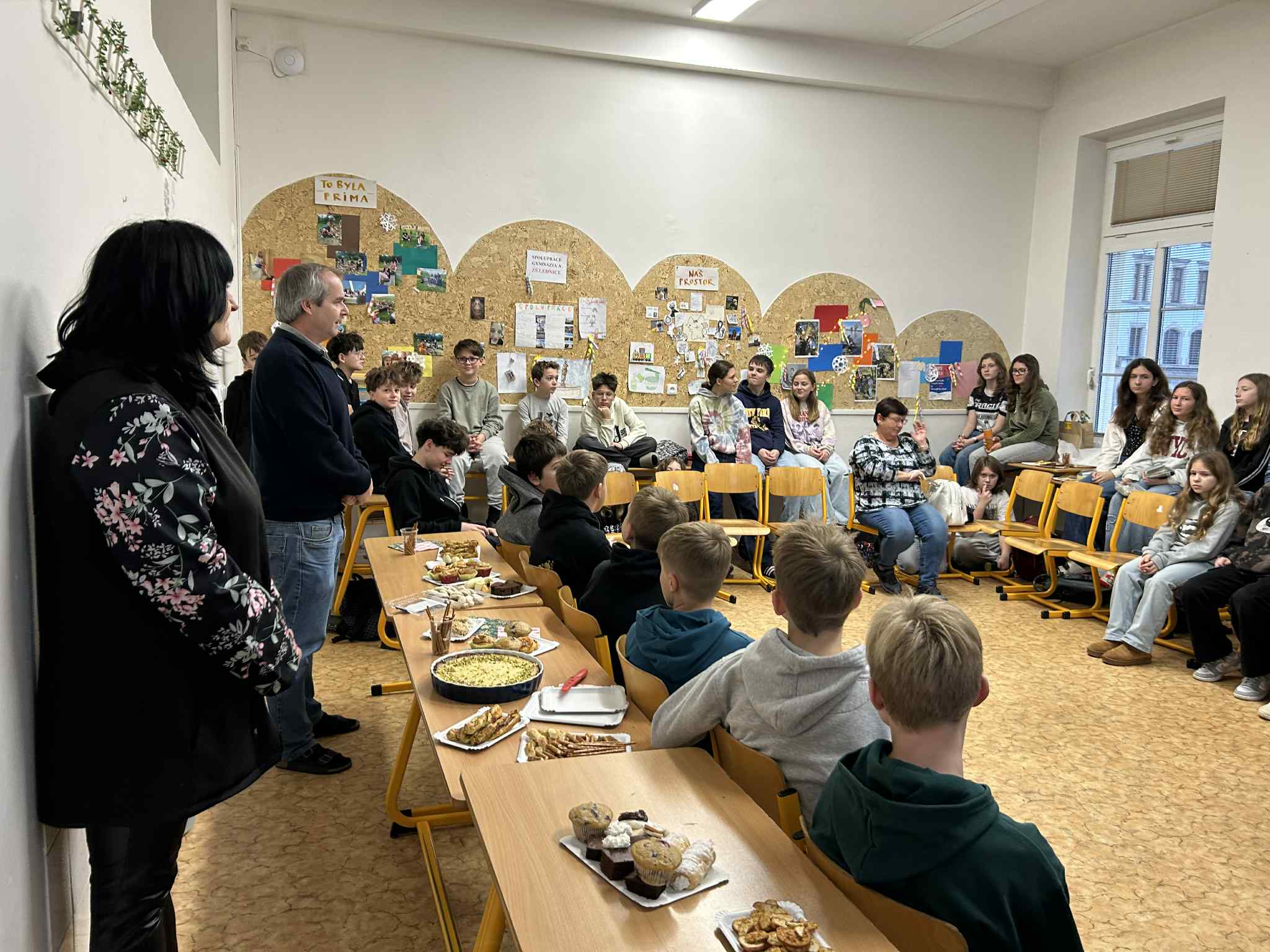 Setkání bylo velmi přátelské, žáci se už znali z předchozího dopisování a někteří si předali drobné dárky. Studenti gymnázia připravili bohaté občerstvení a originální dárky pro naše děti – jedna studentka vytvořila z korálků přívěsek ještěrky „Salamandra“, symbol školního časopisu, a další uháčkovala malé chobotničky.